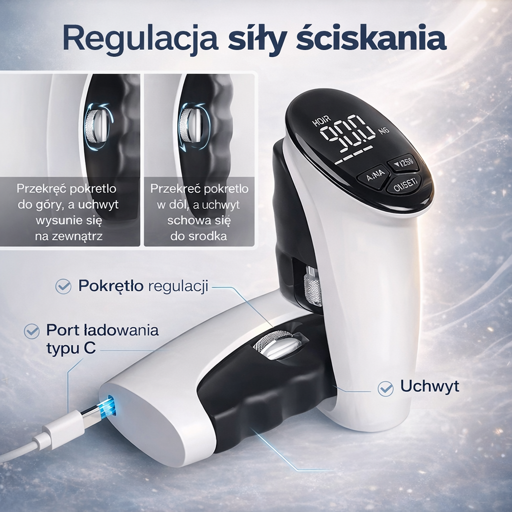 👉 Regulowany uchwyt — dopasowany do każdej dłoni